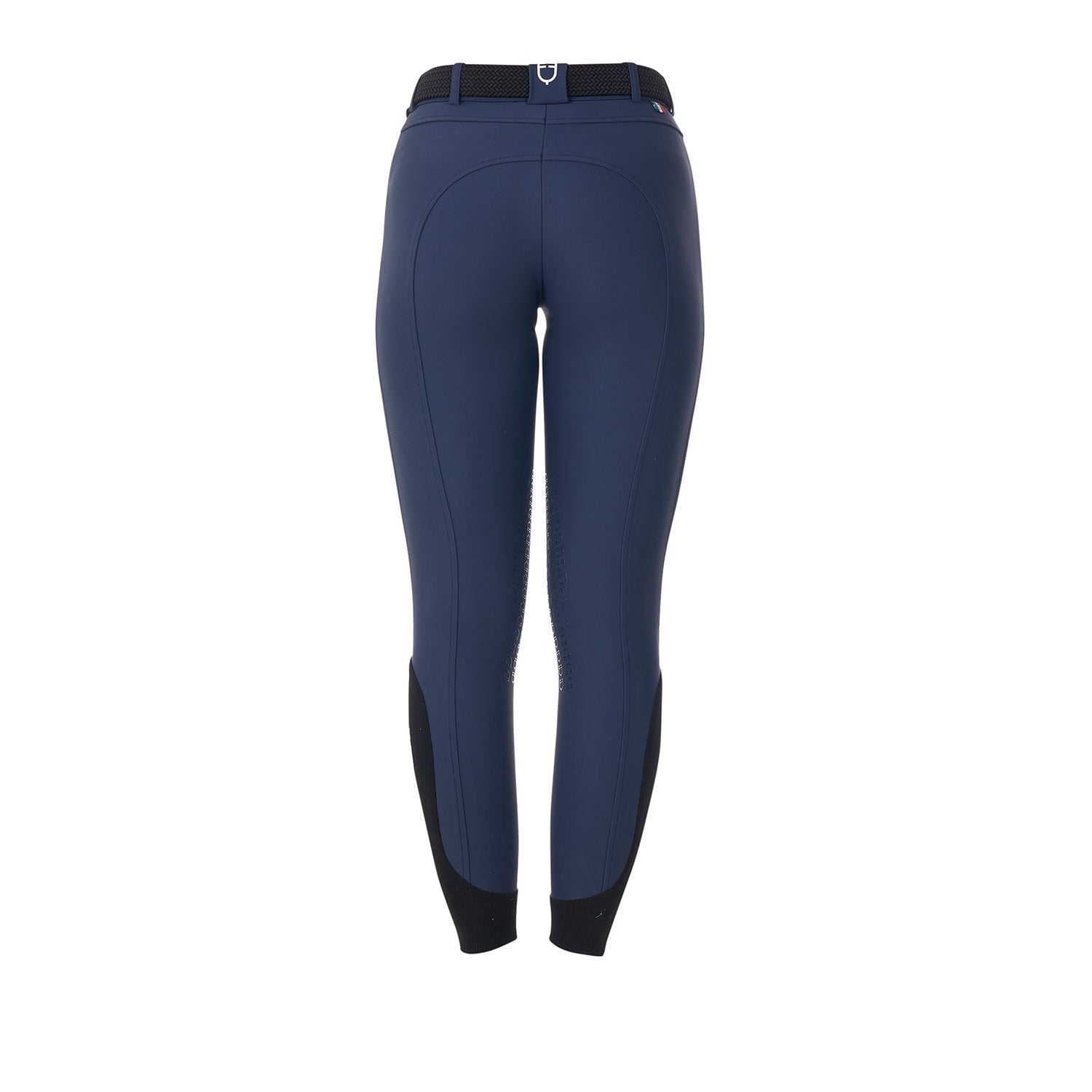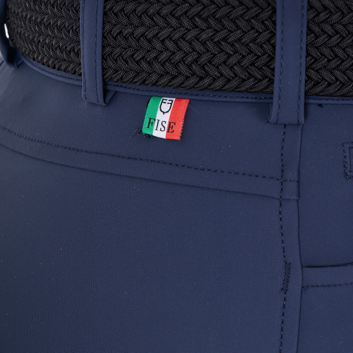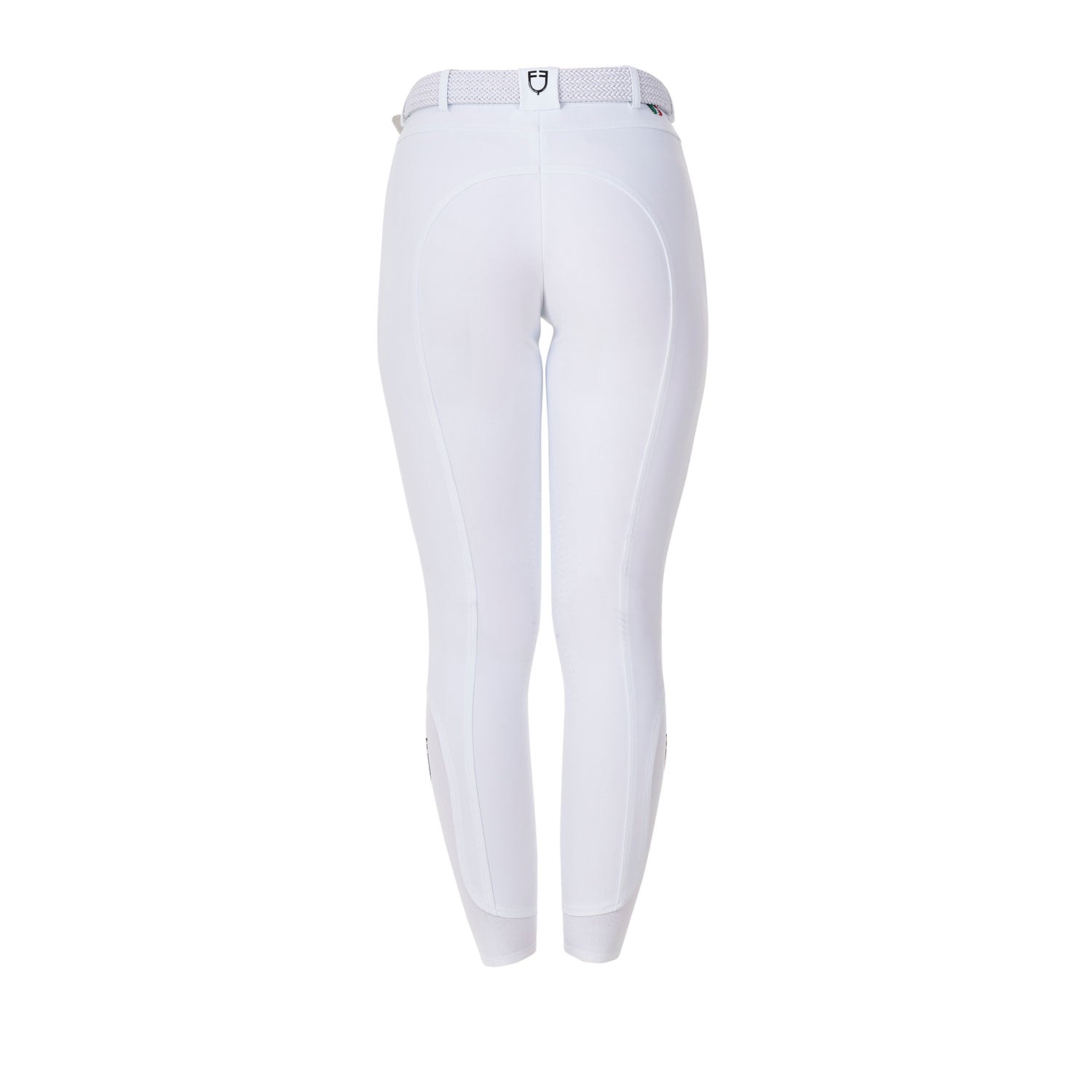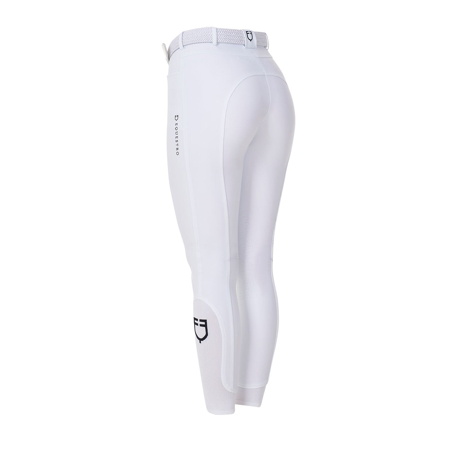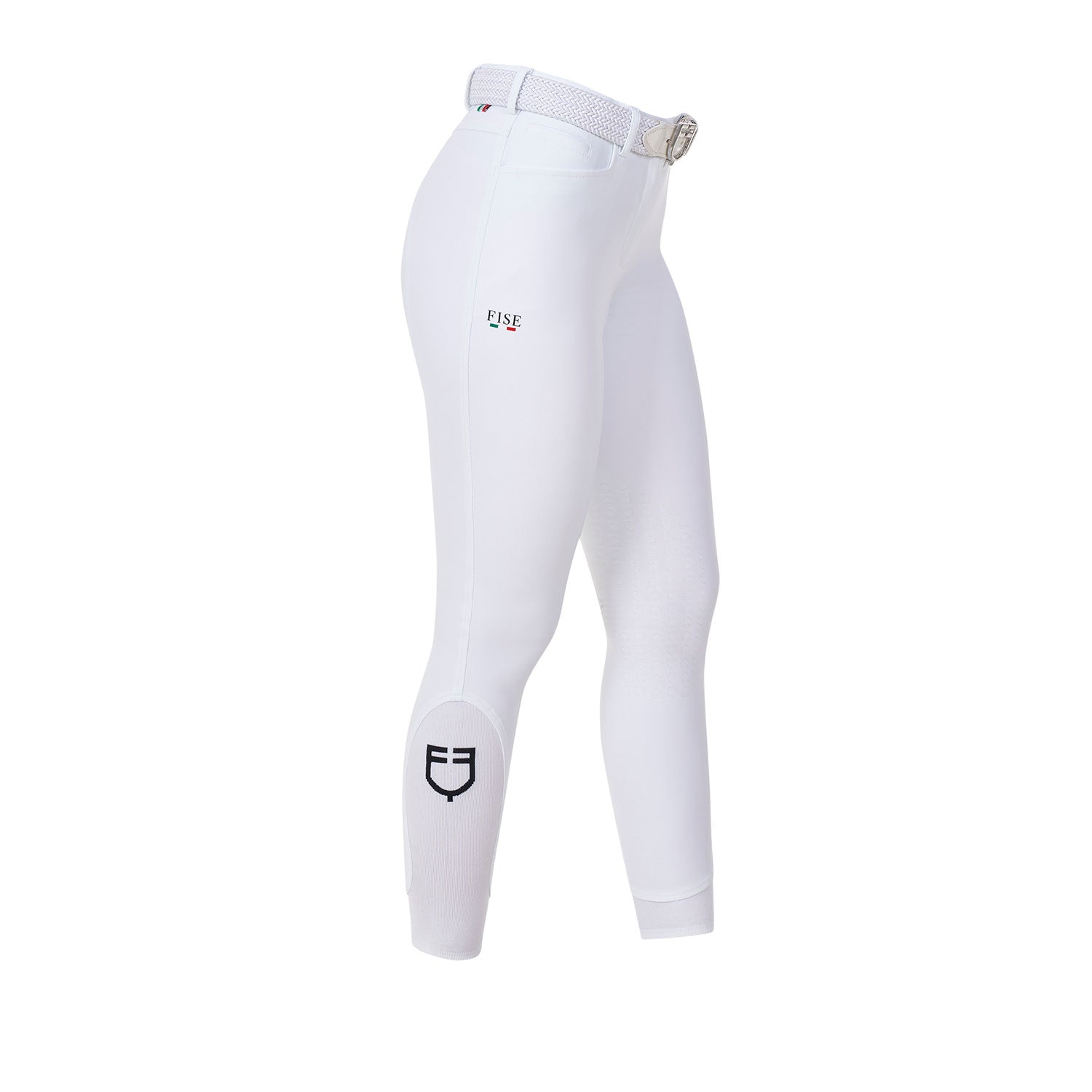 Equestro X FISE women's slim fit breeches in bi-elastic and breathable technical fabric with silicone grip on the inside of the knee. Equestro X FISE women's slim fit breeches, in latest-generation bi-elastic and breathable technical fabric, featuring elastane inserts at the base of the ankle to ensure practicality in the fit.