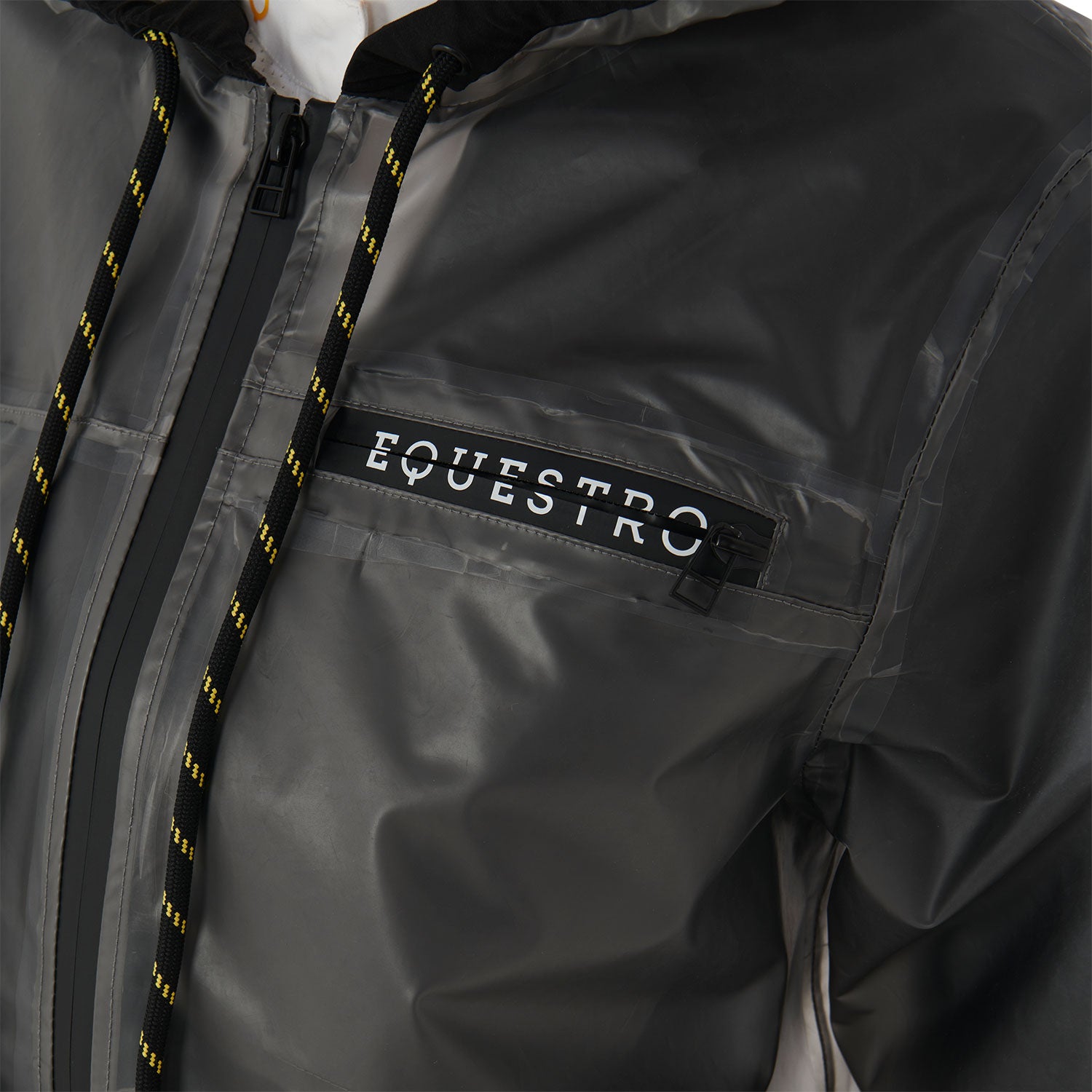The Equestro Women's Transparent Technical Raincoat offers dependable protection with its windproof, water-repellent fabric that ensures freedom of movement. Designed with thermo-laminated seams and windproof zips, it provides full waterproofing to keep you dry in any weather. Featuring a stylish logo on the chest, this raincoat is perfect for staying comfortable and focused during rainy training sessions and competitions.