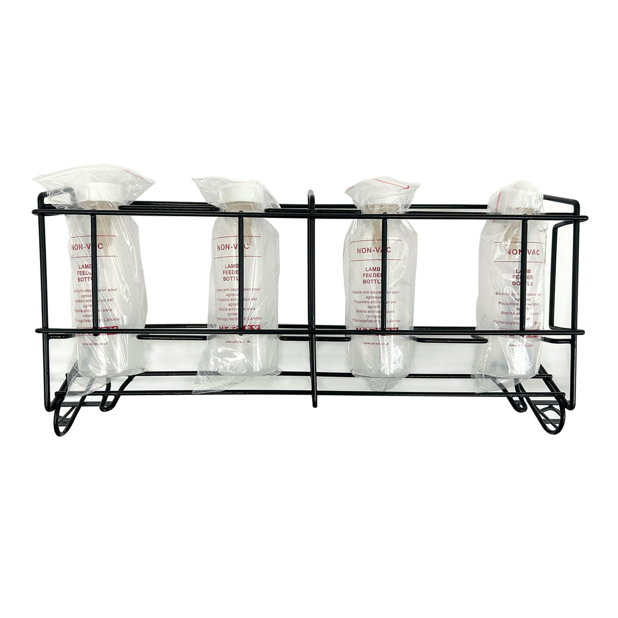 Innovative multi-lamb feeder for effective rearing of orphan lambs. Feed one to four lambs simultaneously and unattended. Coated for long life, the bottle rack system can be fixed to the front of the pen or on hung fences, walls etc. Comes complete with fixing screws, four non-vac bottles, non-vac teats and collars. Please note: colour of rack may vary.