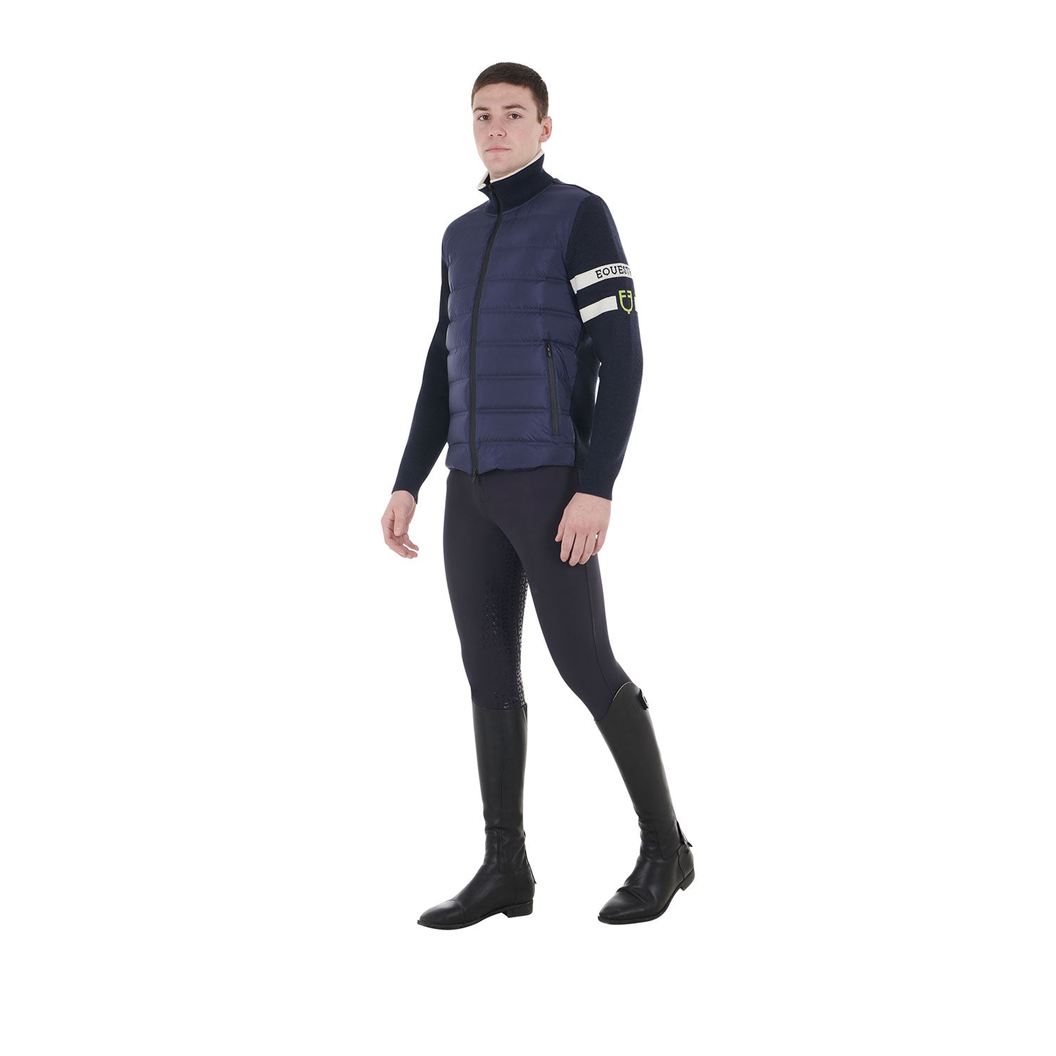 This men's jacket combines technical fabric with knitted inserts on the sleeves and collar, offering both style and functionality. Its windproof front zip closure features an ergonomic silicone pull for easy, secure use. The tailored fit and elegant horizontal quilting create a sleek silhouette, while side pockets enhance practicality without compromising design. Knitted inserts provide added warmth and comfort, making this jacket a perfect choice for those seeking modern aesthetics and reliable performance.