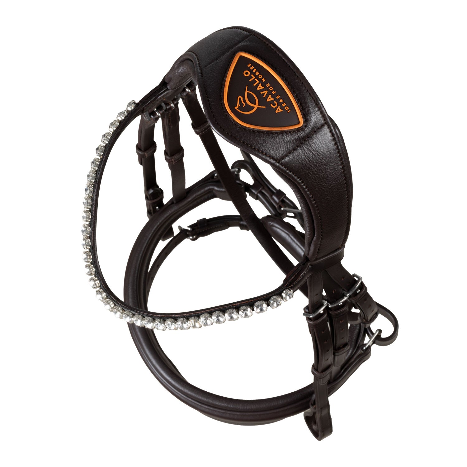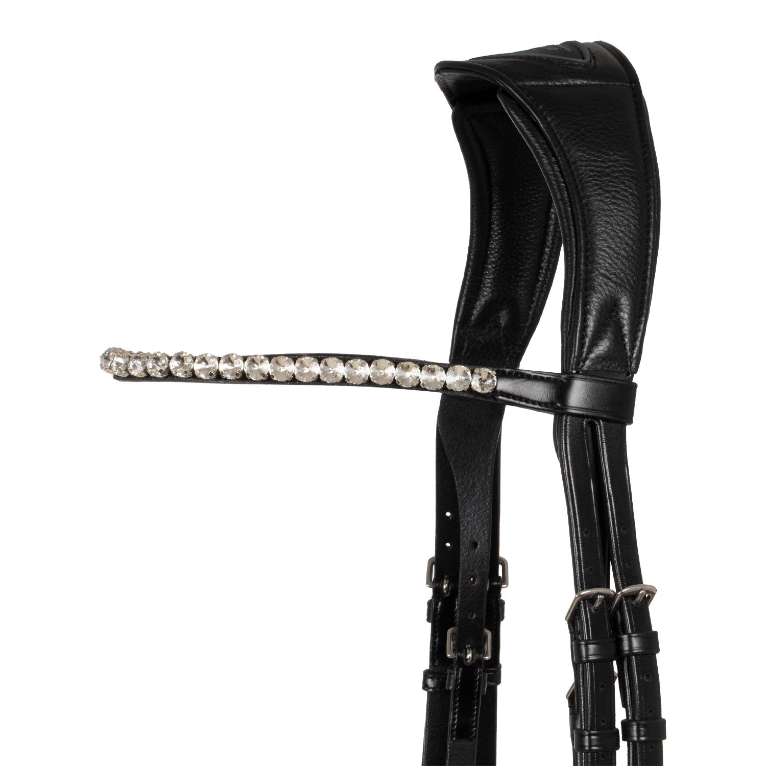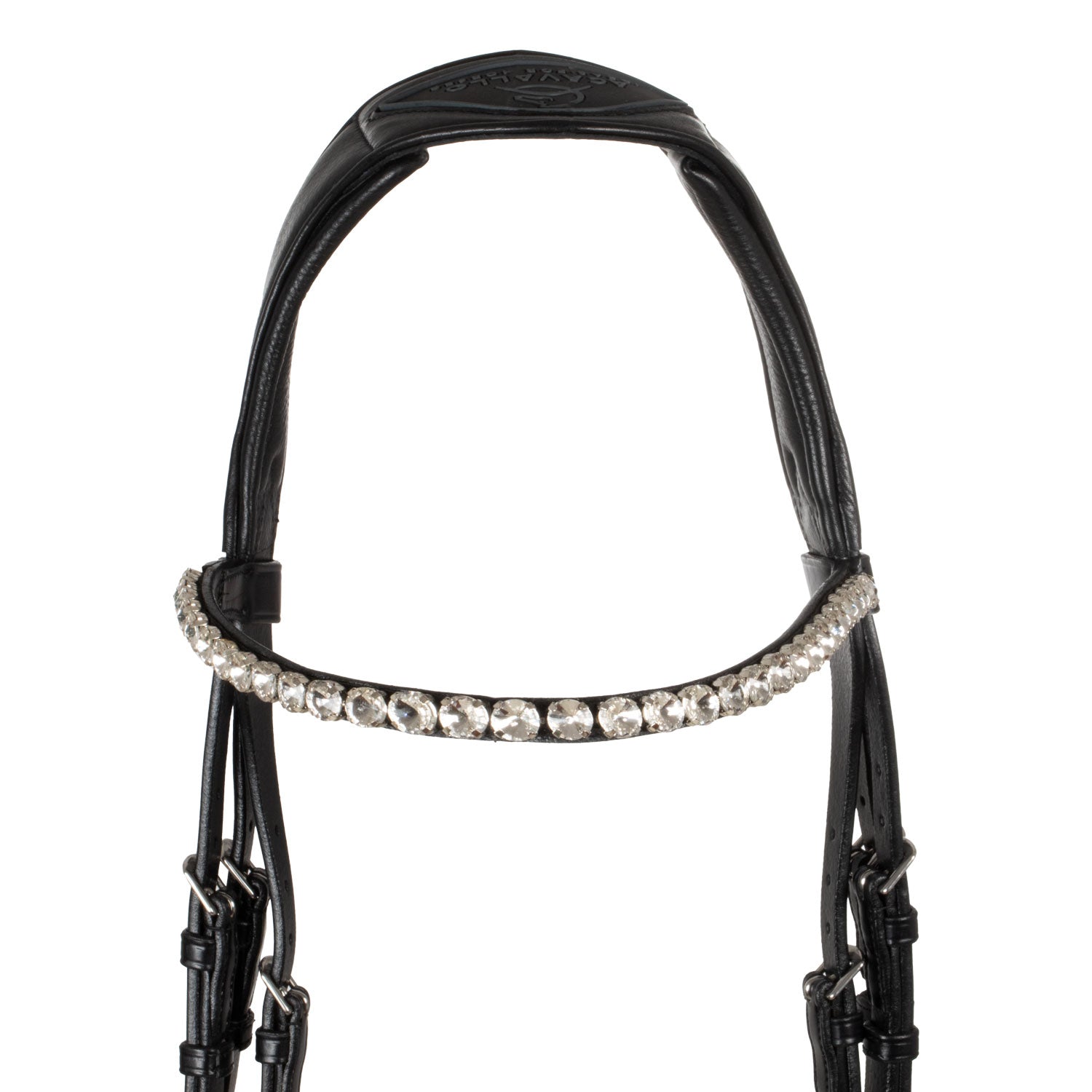 Crafted from premium Italian calfskin, the Acavallo Starry Night Bridle exemplifies expert artisan quality. Its anatomically shaped headpiece features dual lateral latex padding, relieving pressure on the horse’s skull for superior comfort. The diamond-covered browband adds a sophisticated sparkle, enhancing its elegant design. Equipped with durable stainless steel buckles, this bridle ensures secure fit and lasting performance. Combining refined style with thoughtful functionality, the Starry Night bridle prioritizes horse welfare without compromising on craftsmanship.