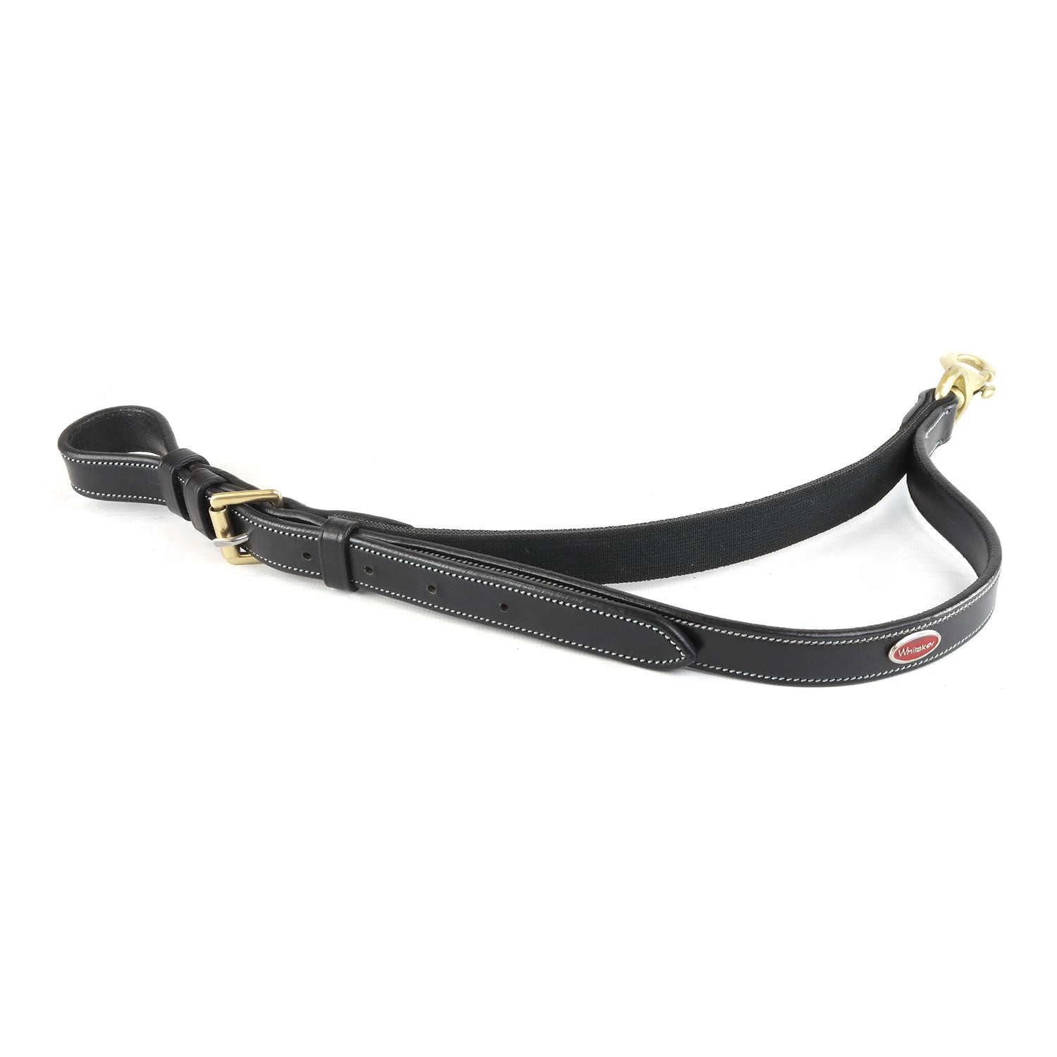 Attaches easily to the horse's breastplate or D-ring martingale. Made from leather with brass clip fastenings, adjustable brass buckles and an elastic strap for adequate give.