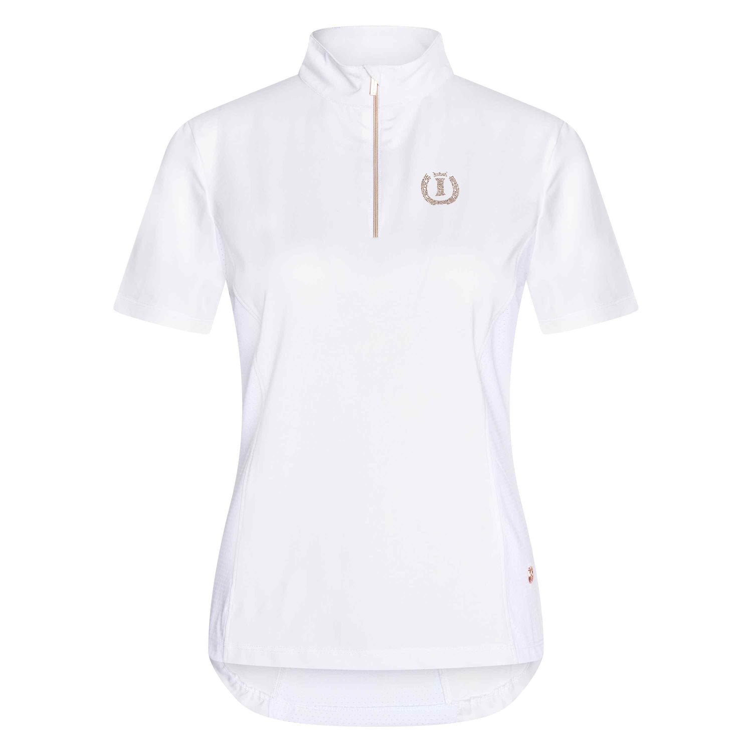 Upgrade your activewear collection with the cutting-edge Tech Top with short sleeves. Made from solid tech jersey and contrast mesh fabric, this top features a half zip with chin protection for added convenience. The logo print at the left chest adds a touch of style, while the shaped hem at the backpart and small standing collar offer a modern look. With a metal coin at the left hem, this top is not only stylish but also functional. The light weight and soft fabric provides maximum comfort, while the excellent elasticity ensures a perfect fit for any activity. Take your workout to the next level with Imperial Riding Tech Top.