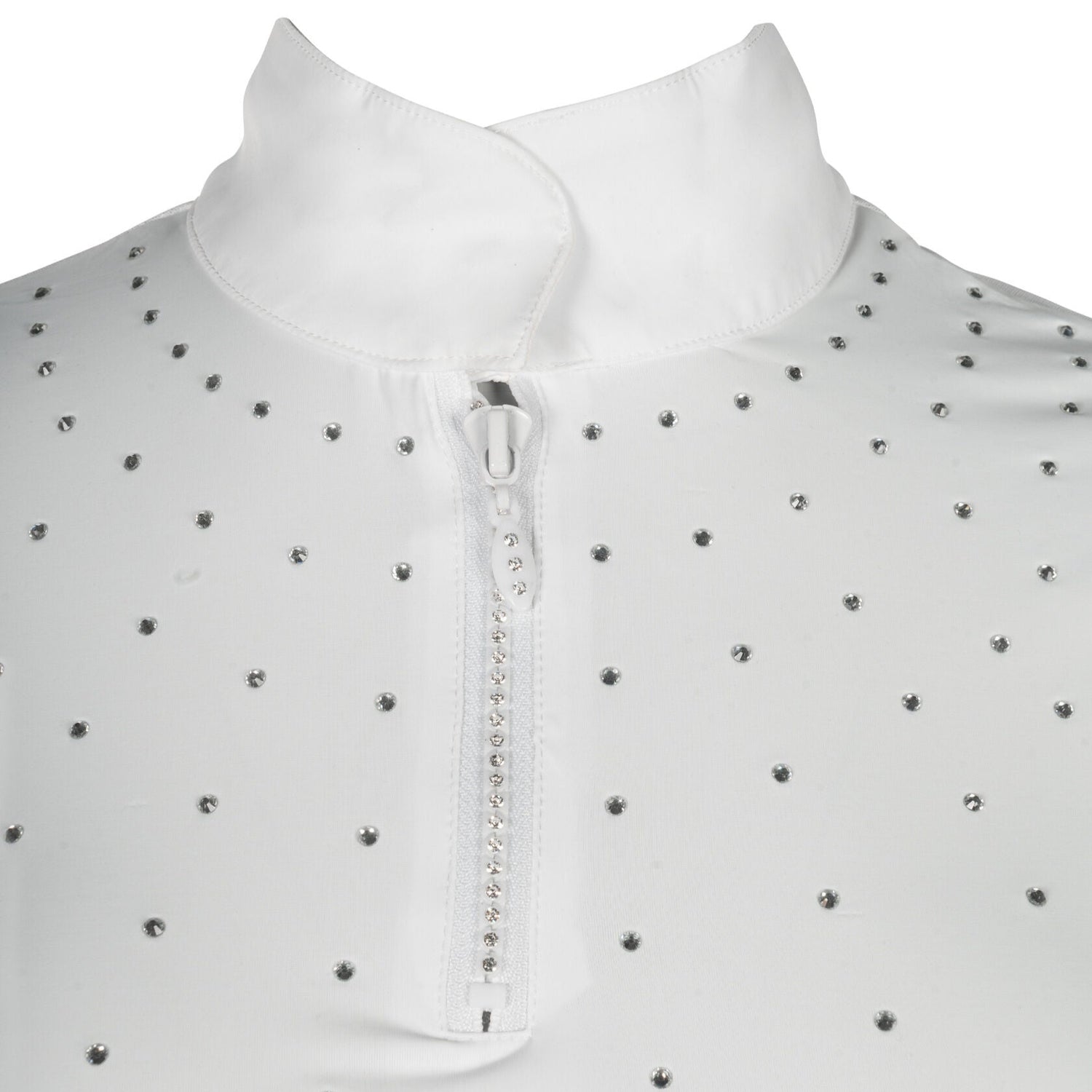 The competition shirt Skadi short sleeve combines functionality with elegant details and ensures a stylish appearance in the arena or on the course. The breathable and elasticated material offers maximum comfort and optimum freedom of movement, while the mesh insert ensures excellent air circulation. The elegant stand-up collar and the zip, which is decorated with integrated rhinestones, give the shirt a sophisticated touch. Fine rhinestone details round off the design and make it a real eye-catcher at any tournament.