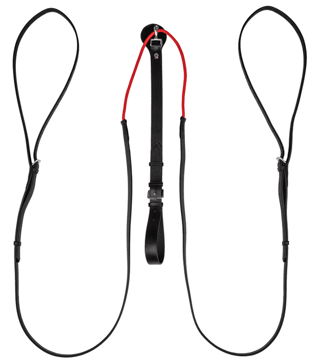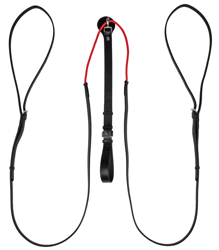 Innovative length-adjustable and flexible leather triangular reins for riding or lunging. The W-trainRein triangular reins are attached to the saddle girth or lunging girth between the front legs. A special rein runs through a pulley and is guided from there through the bridle rings (from the inside to the outside) back to the saddle girth or lunging girth. The pulley allows the reins to yield and facilitates gentle and mouth-friendly bending and gymnasticising while riding or lunging.