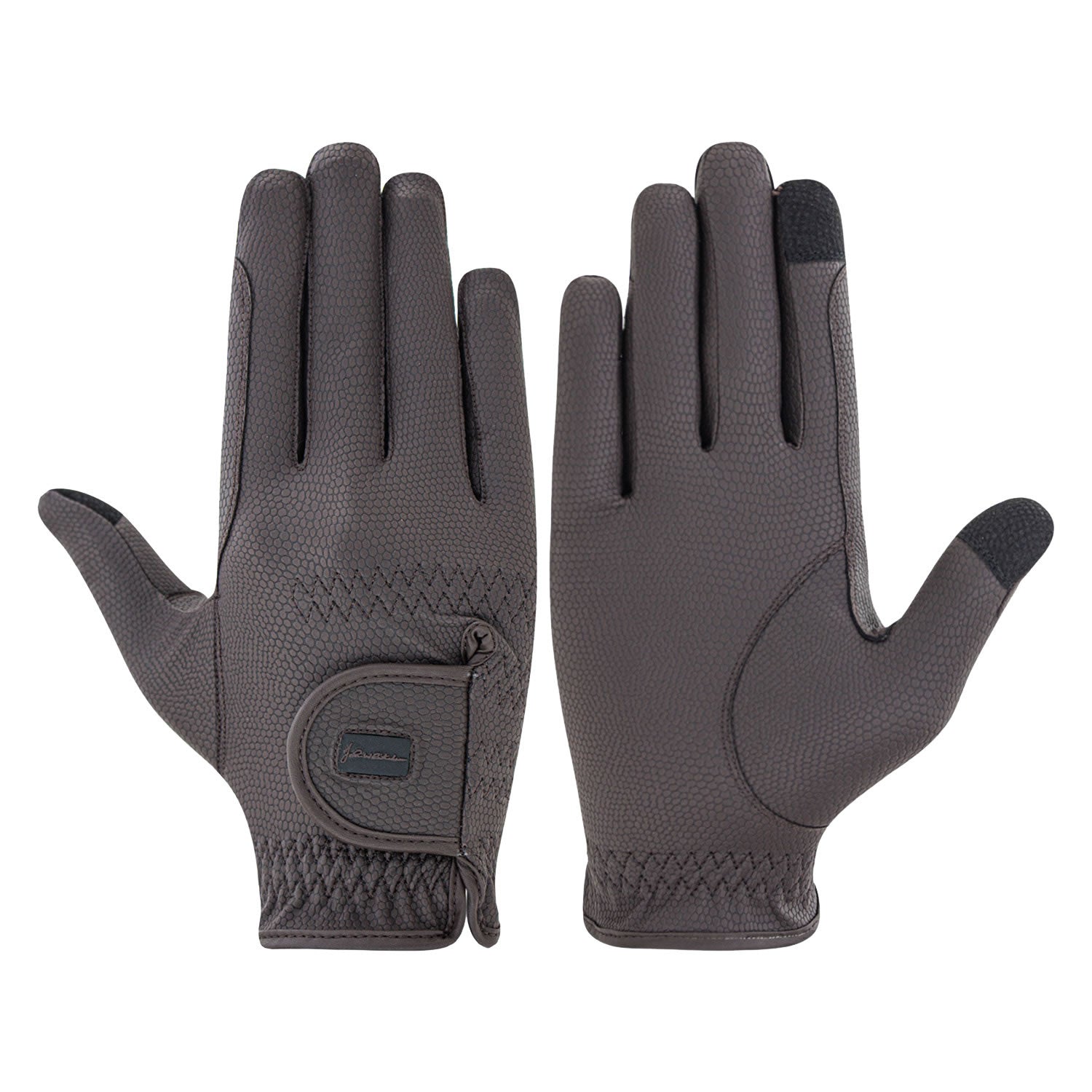 Sleek and classic, the Wellington is the perfect finishing touch to any competition outfit. The synthetic leather upper is exceptionally durable yet offers a comfortable stretch and is embossed with a crocodile effect print. The close contact fit, coupled with the velcro closure and elastic panels wont impede your sensitivity and communication with the horse. Reinforced fingers and touchscreen compatable. Logo adheres to British Dressage regulations.