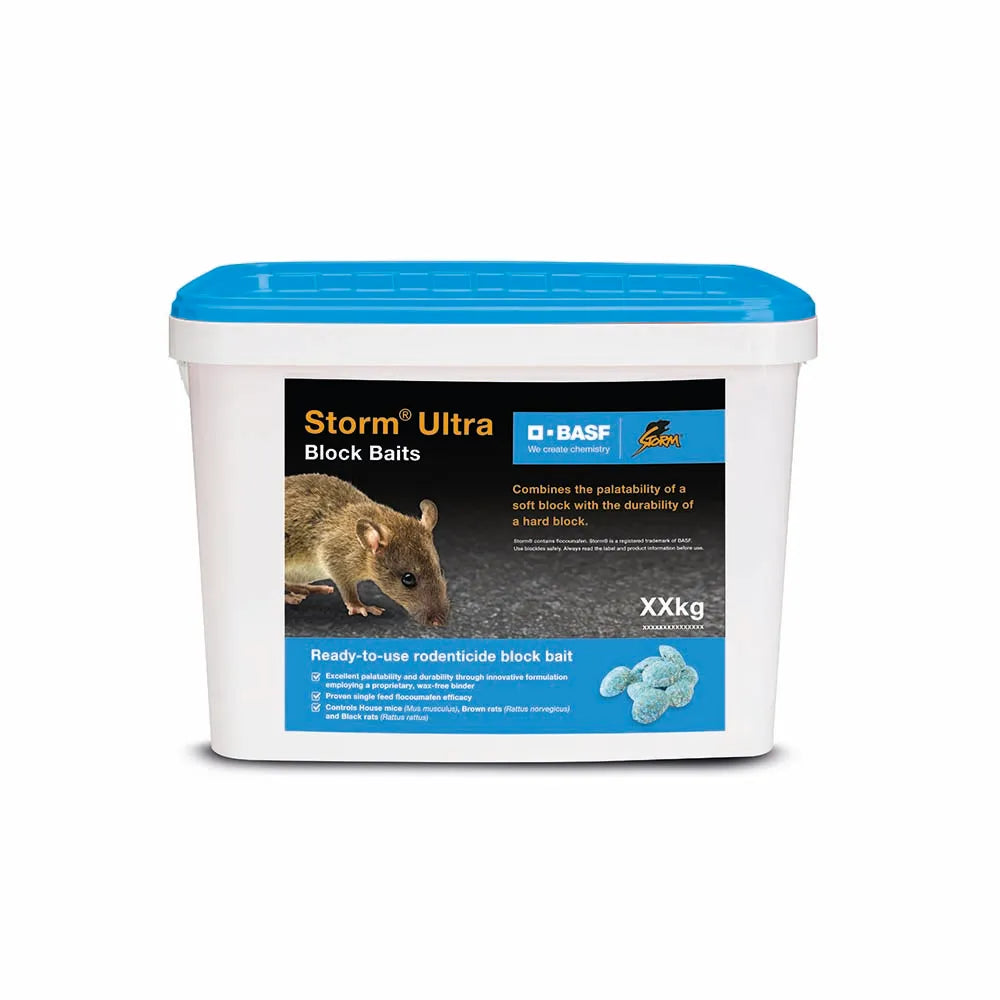 Storm® Ultra is a powerful, ready-to-use rodenticide block bait providing pest controllers with fast and effective rodent control. Its highly potent, highly palatable, patented formulation features the active flocoumafen to deliver a lethal dose in a single feed, and a high quality cereal content that has been proven to be twice as palatable as leading anticoagulant baits.