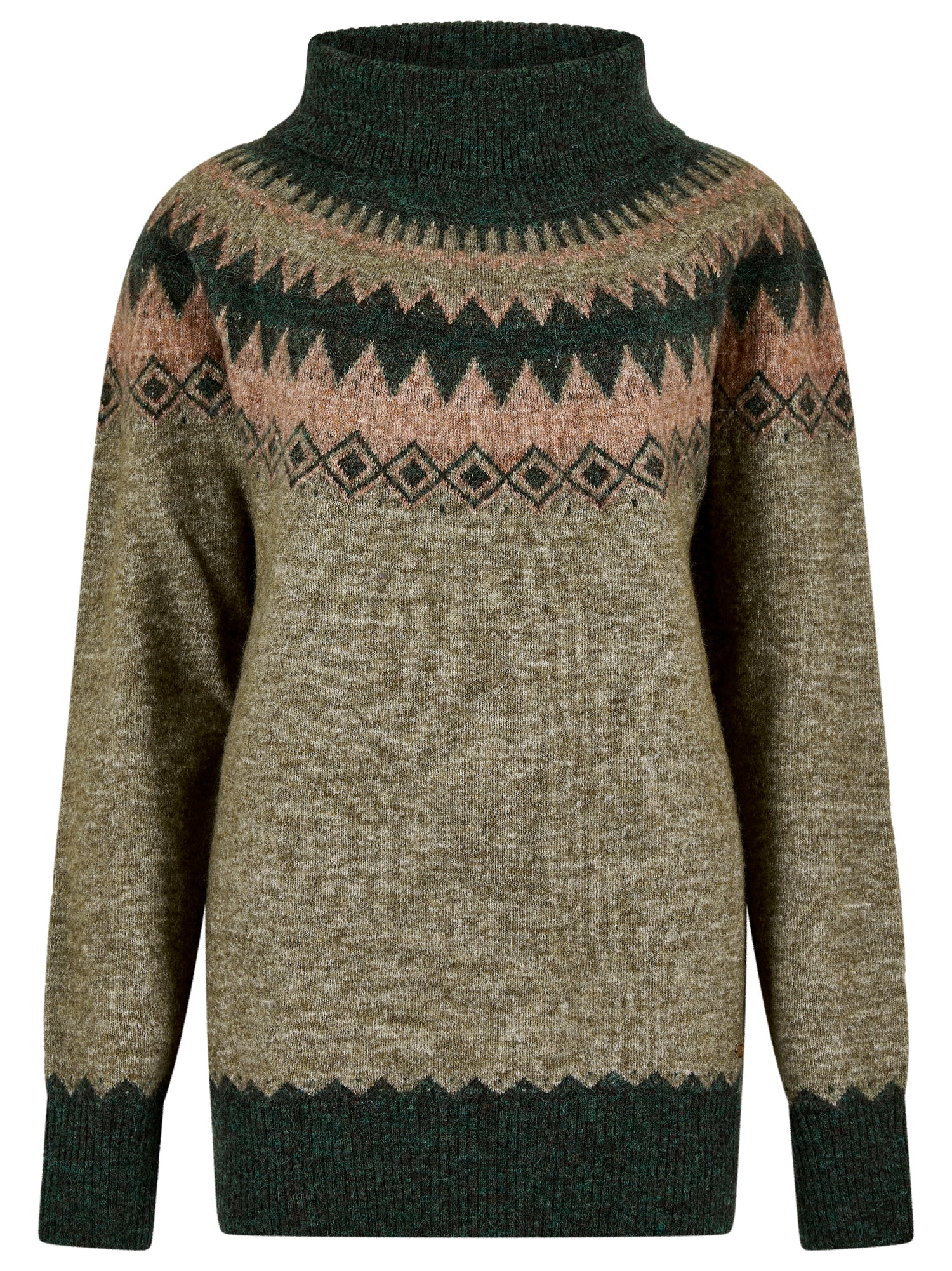 When you want warmth and layers without the bulk, the Dubarry roll neck Devlin jumper, knitted in a soft, durable alpaca blend yarn has the answer. A bold Fair Isle pattern in earthy tones brings richness to any seasonal outfit and a flattering length works perfectly with Dubarry honey suckle jeans and your choice of Country Boots.