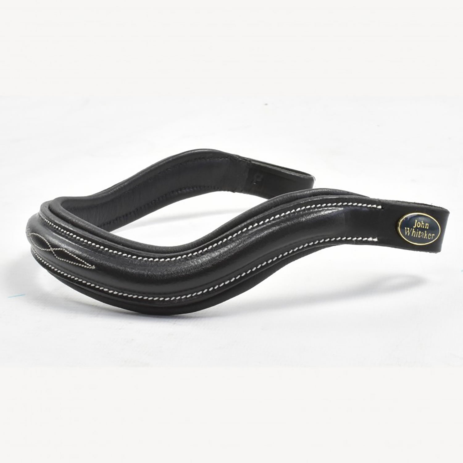 Curved square shaped browband elongates and creates freedom around sensitive ears. Crafted from quality leather with contrast patterned stitching. Featuring a deep curved design to elongate the face, a round, raised desigh, soft leather padding and a brass and navy JW badge.