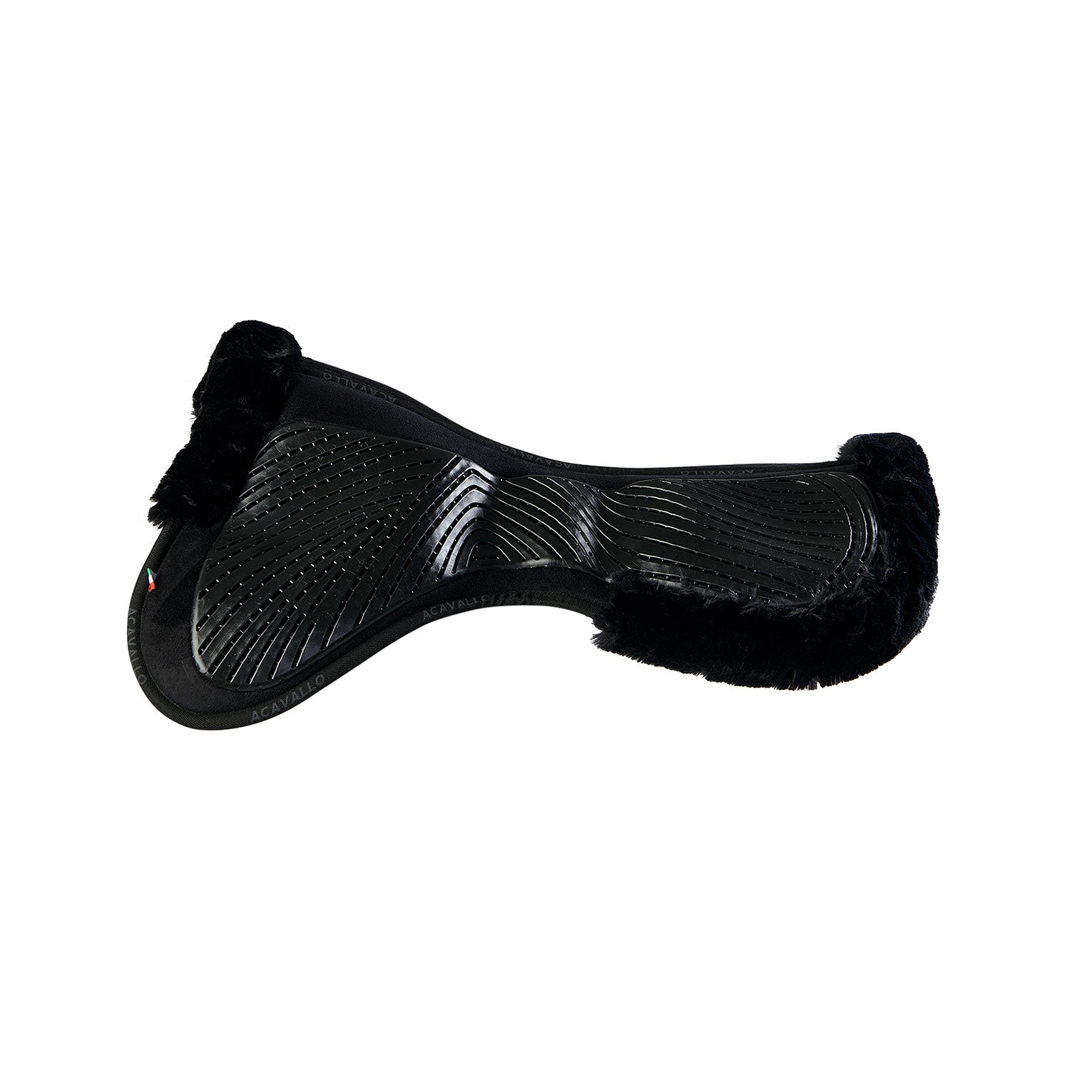 The Acavallo® flat pad in memory foam jumping close contact shape in suede and cut-out faux sheepskin with gel grip is an exceptional solution that combines the performance of Acavallo® gel and memory foam technology, offering your horse a superior riding experience in terms of comfort and safety.