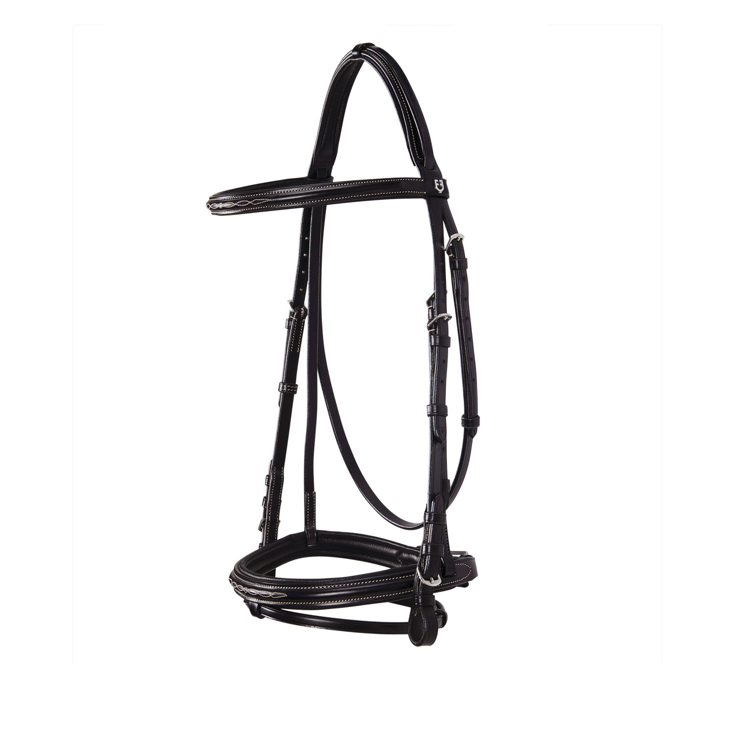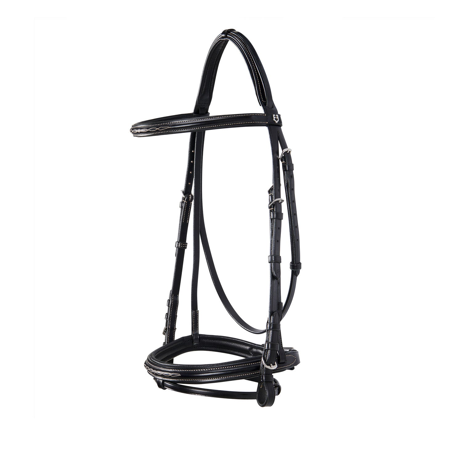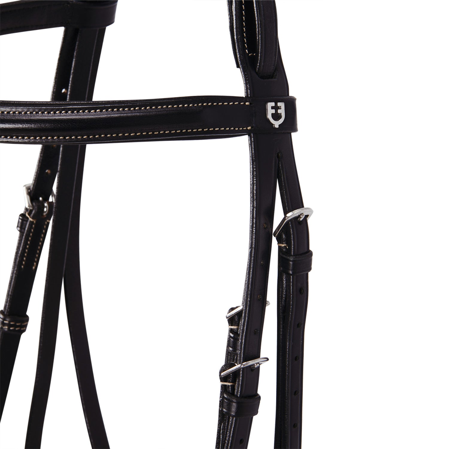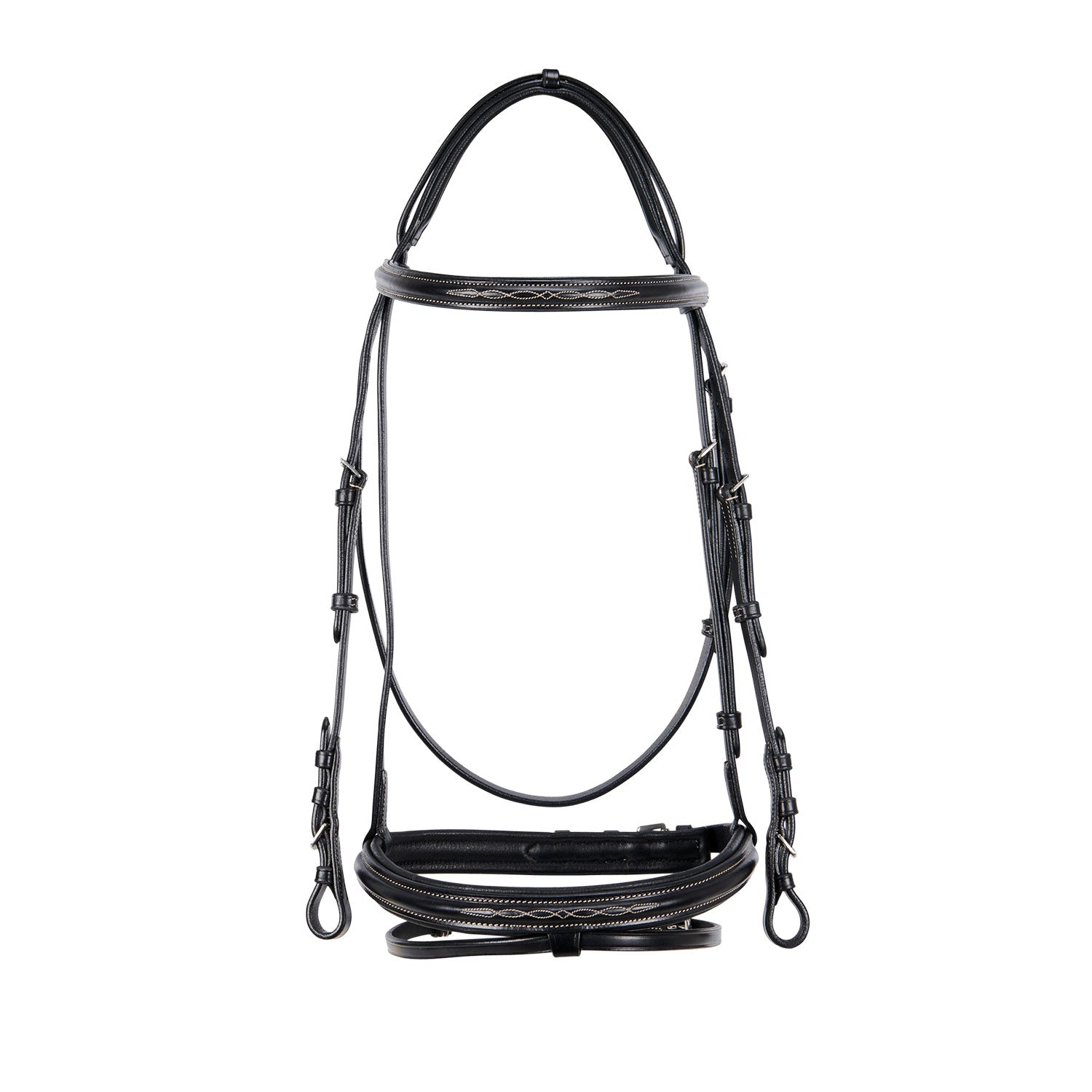 Deco English bridle in high quality soft Italian leather, for perfect communication between horse and rider. English bridle in high quality soft leather, with stainless steel buckles and rubber reins that give safety, stability and resistance over time. Padded browband and noseband decorated with contrasting embroidery, for a unique style. The browband and chin straps are both adjustable for a perfect fit and maximum comfort.