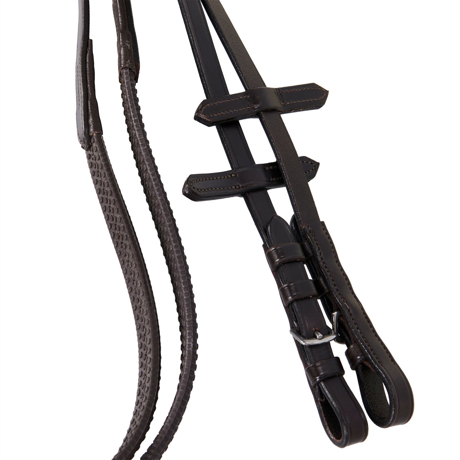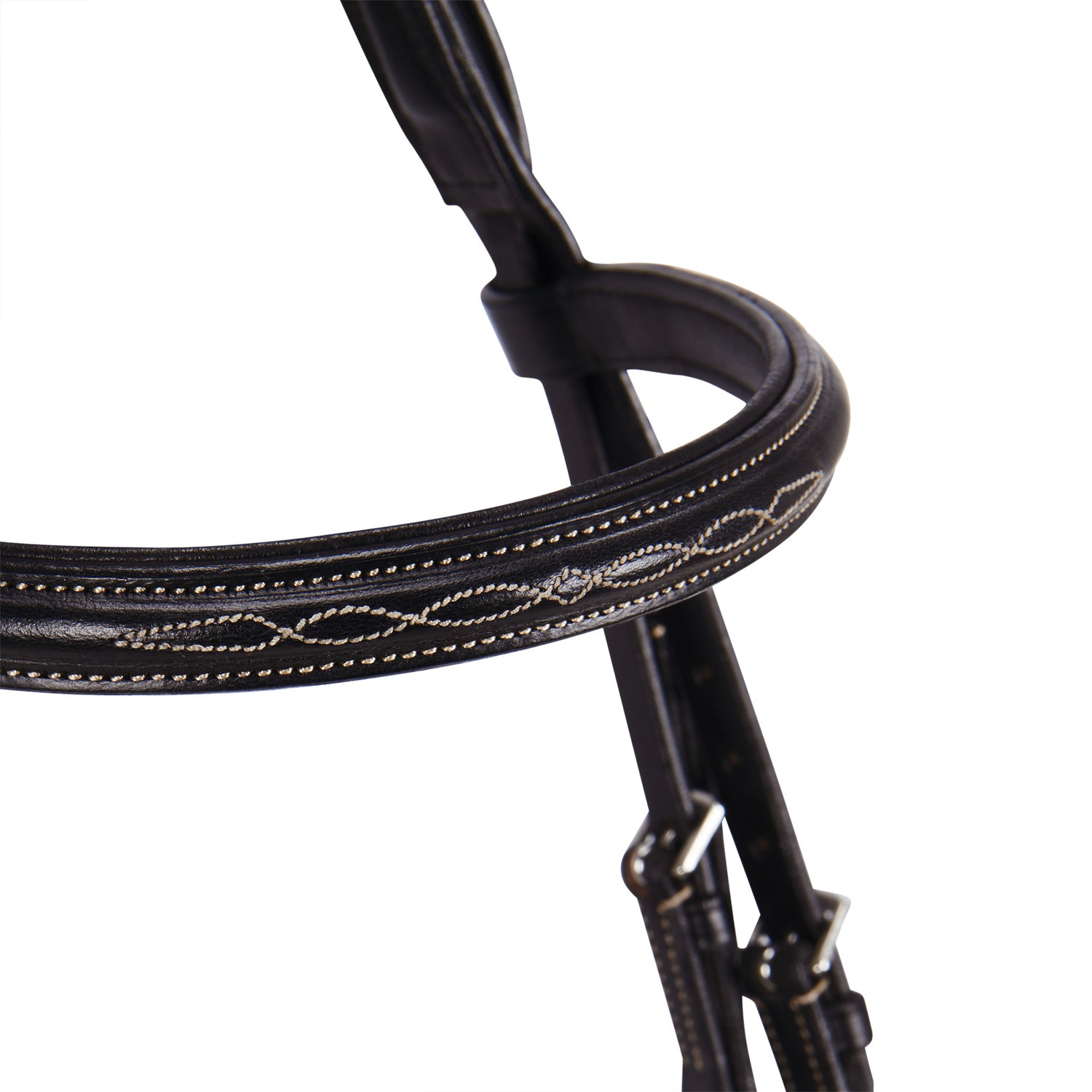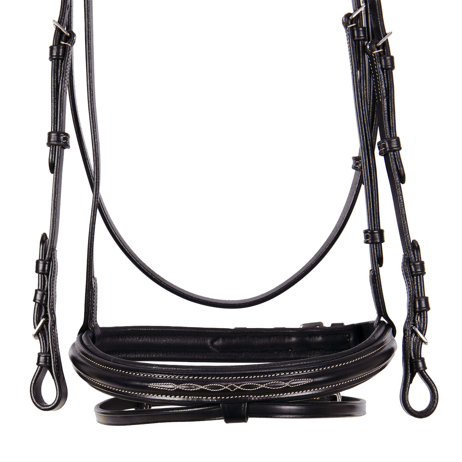 Deco English bridle in high quality soft Italian leather, for perfect communication between horse and rider. English bridle in high quality soft leather, with stainless steel buckles and rubber reins that give safety, stability and resistance over time. Padded browband and noseband decorated with contrasting embroidery, for a unique style. The browband and chin straps are both adjustable for a perfect fit and maximum comfort.