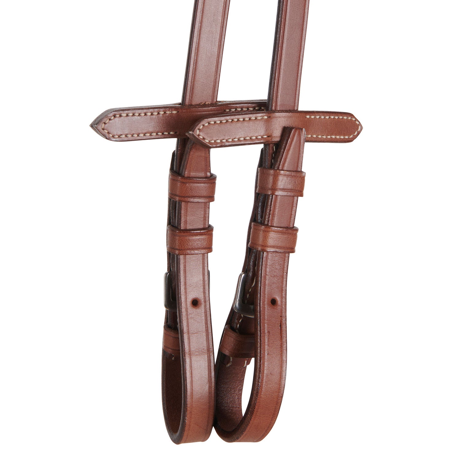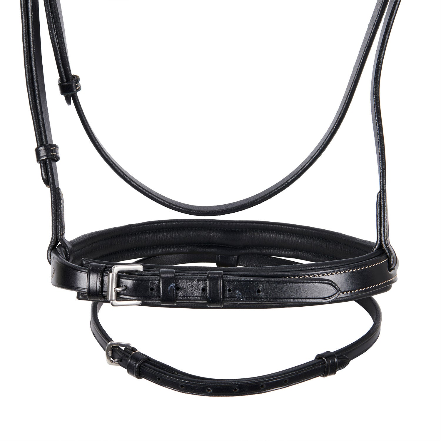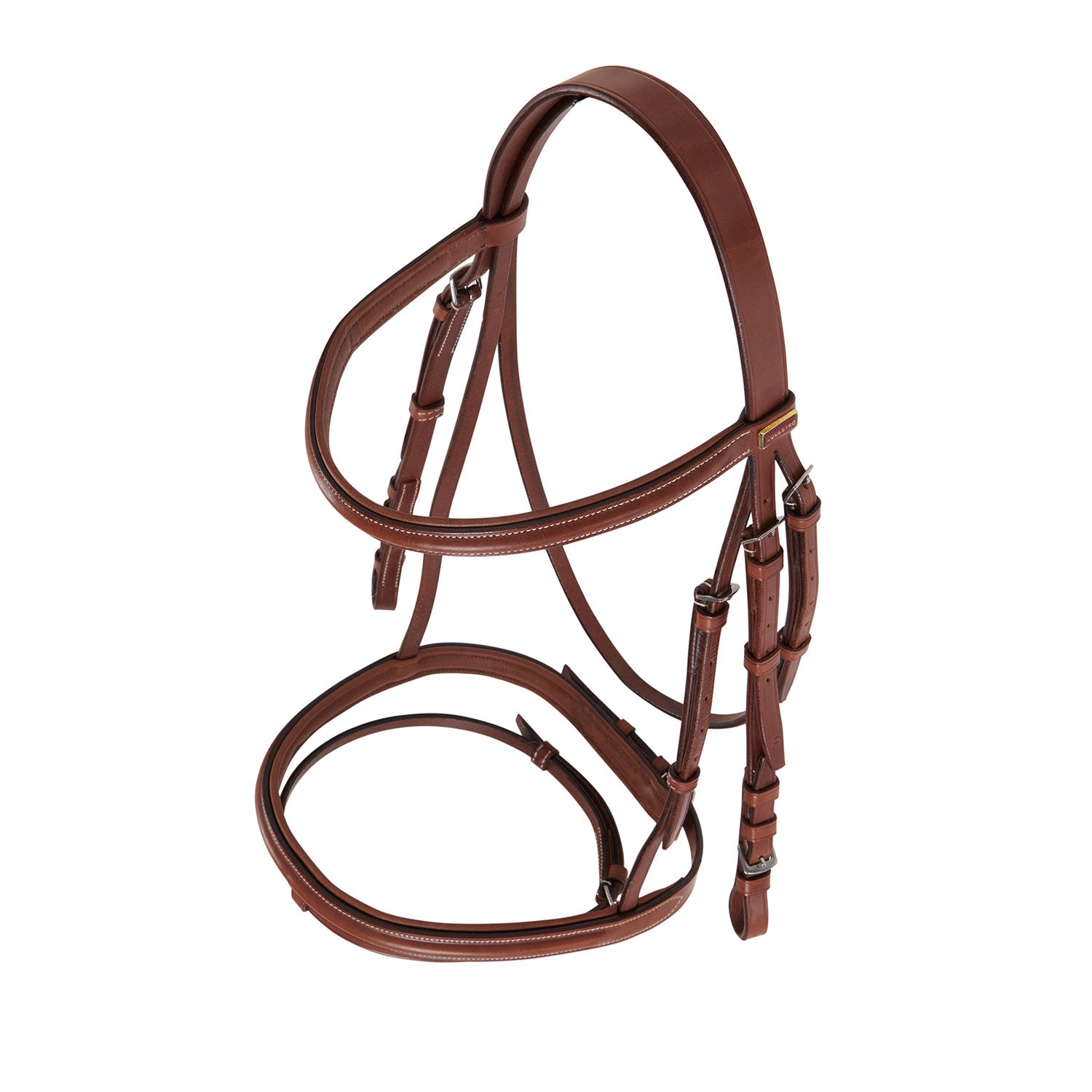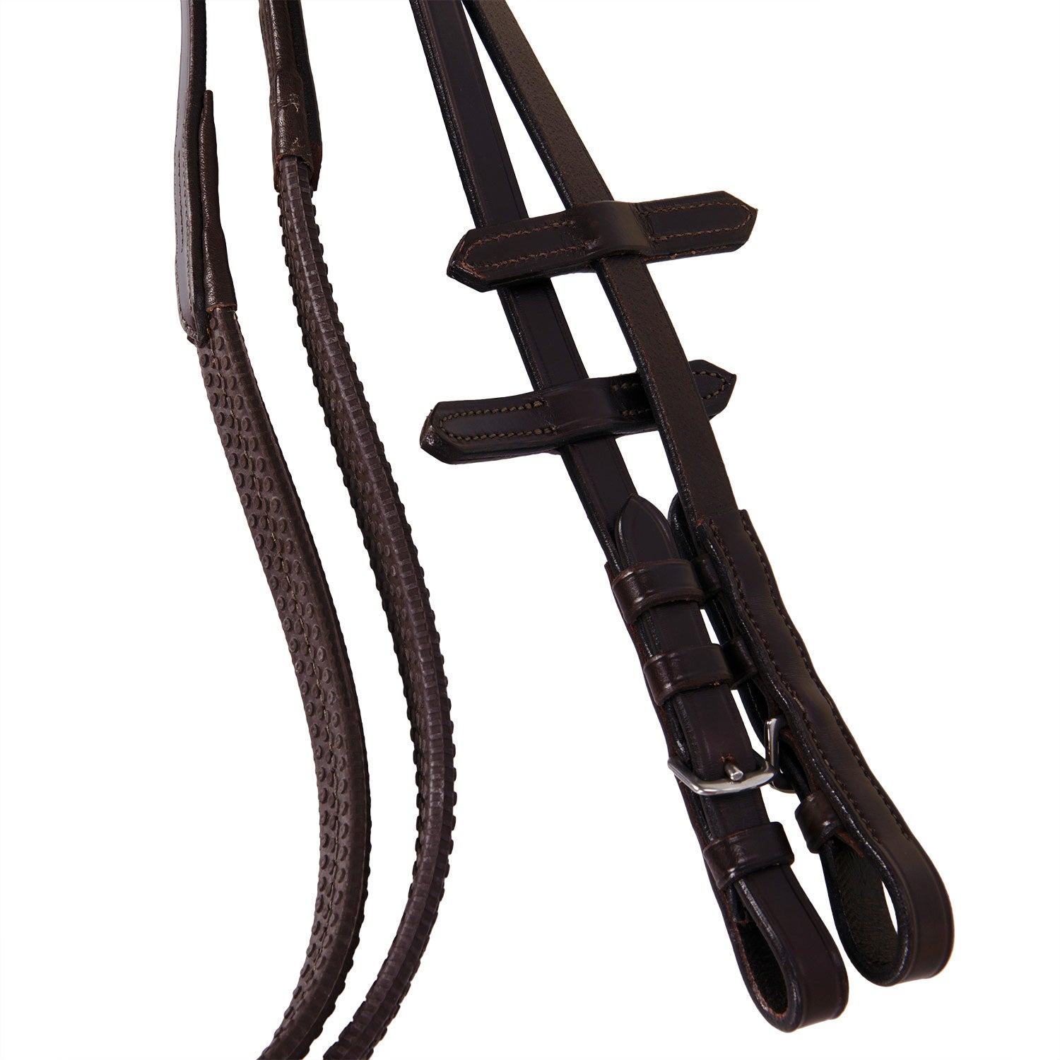 Deco English bridle in high quality soft Italian leather, for perfect communication between horse and rider. English bridle in high quality soft leather, with stainless steel buckles and rubber reins that give safety, stability and resistance over time. Padded browband and noseband decorated with contrasting embroidery, for a unique style. The browband and chin straps are both adjustable for a perfect fit and maximum comfort.