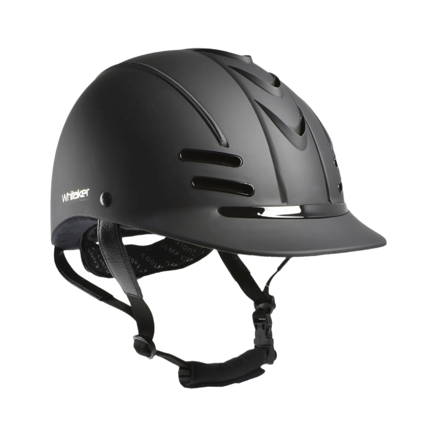 The Whitaker Club Young Rider Helmet is designed for UK competitions and everyday riding, available in just two shell sizes for a streamlined fit. It features a fixed peak, strategically placed side and top vents for optimal airflow, and a removable, machine-washable Coolmax lining. The adjustable dial ensures a personalized fit. Navy, red, and black versions include subtle black piping and inserts. Certified to SEI ASTM F1163-23 and EN 1384:2023 with CE standards, this helmet combines safety with smart, practical design.
